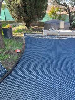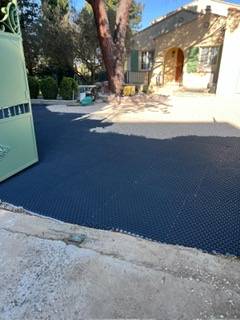Aménagement d’une allée avec pose de stabilisateur de gravier pour un rendu propre, durable et confortable au quotidien.